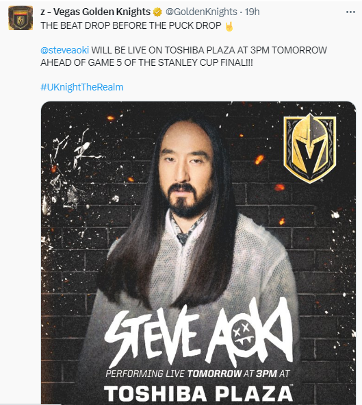 Before the puck drops at 5:20 PM, a big name in Las Vegas music will be getting fans pumped up. Steve Aoki is set to perform at 3 PM.