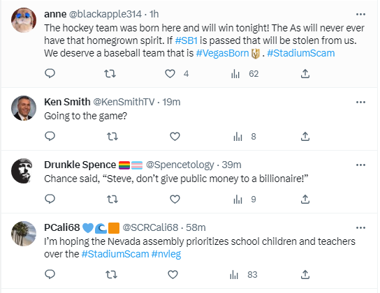 And even if the Assembly speaker tried to keep it about the Golden Knights in his tweet, the reactions were about the Athletics’ request for a stadium construction subsidy. Take a look: