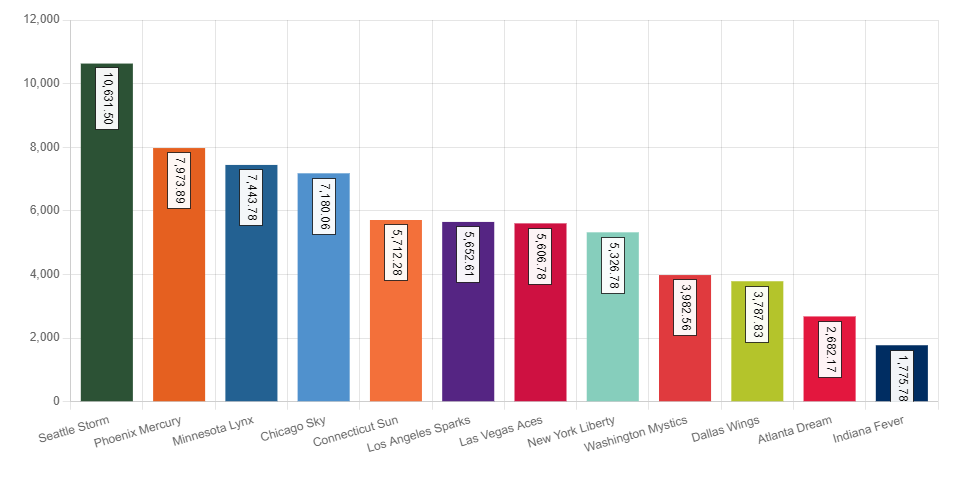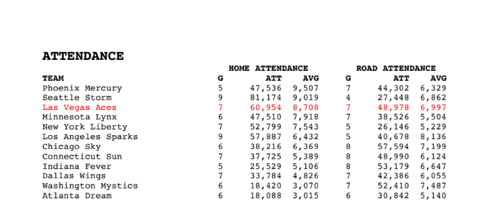 The Aces’ big spike in attendance is typical for a team in the season following winning a league title in the prior season. As you can see by this graphic, the Aces were in the middle of the 12-team WNBA last season.