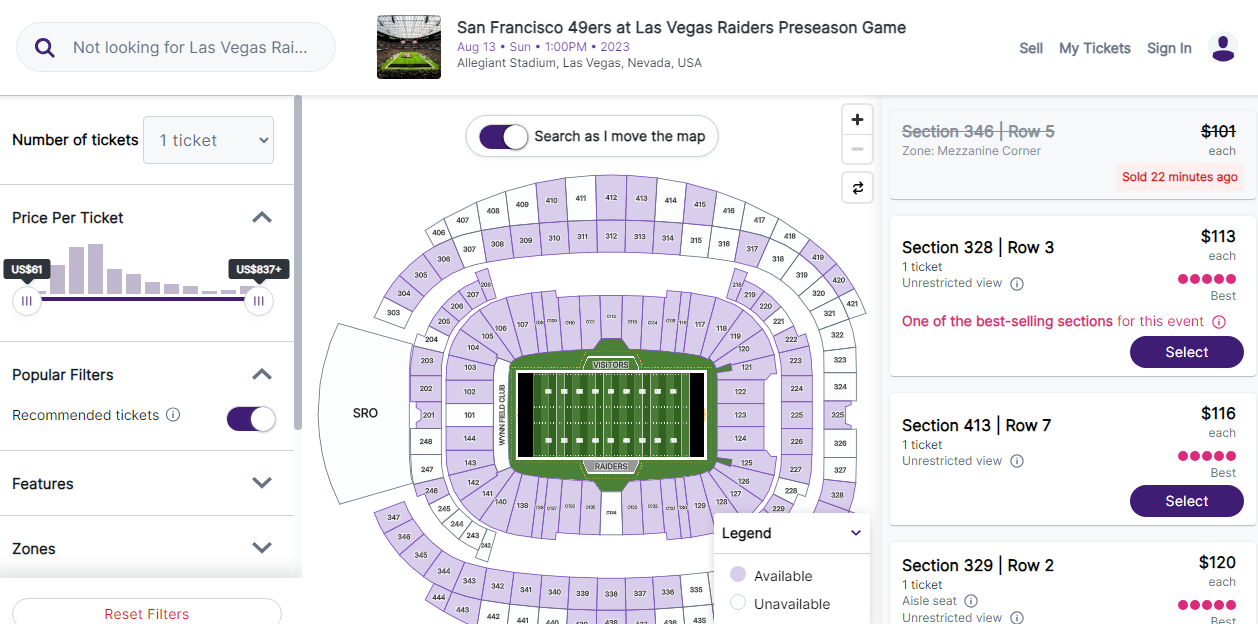 LVSportsBiz.com took a peak at the Raiders-49ers preseason game ticket cost and saw the cheapest ticket was $113 for the first exhibition game of 2023.