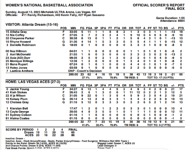 Aces Pull Away From Atlanta Dream As Raiders/Aces Owner Mark Davis Enjoys Doubleheader Sweep Sunday; Aces Announced Attendance, 8,564