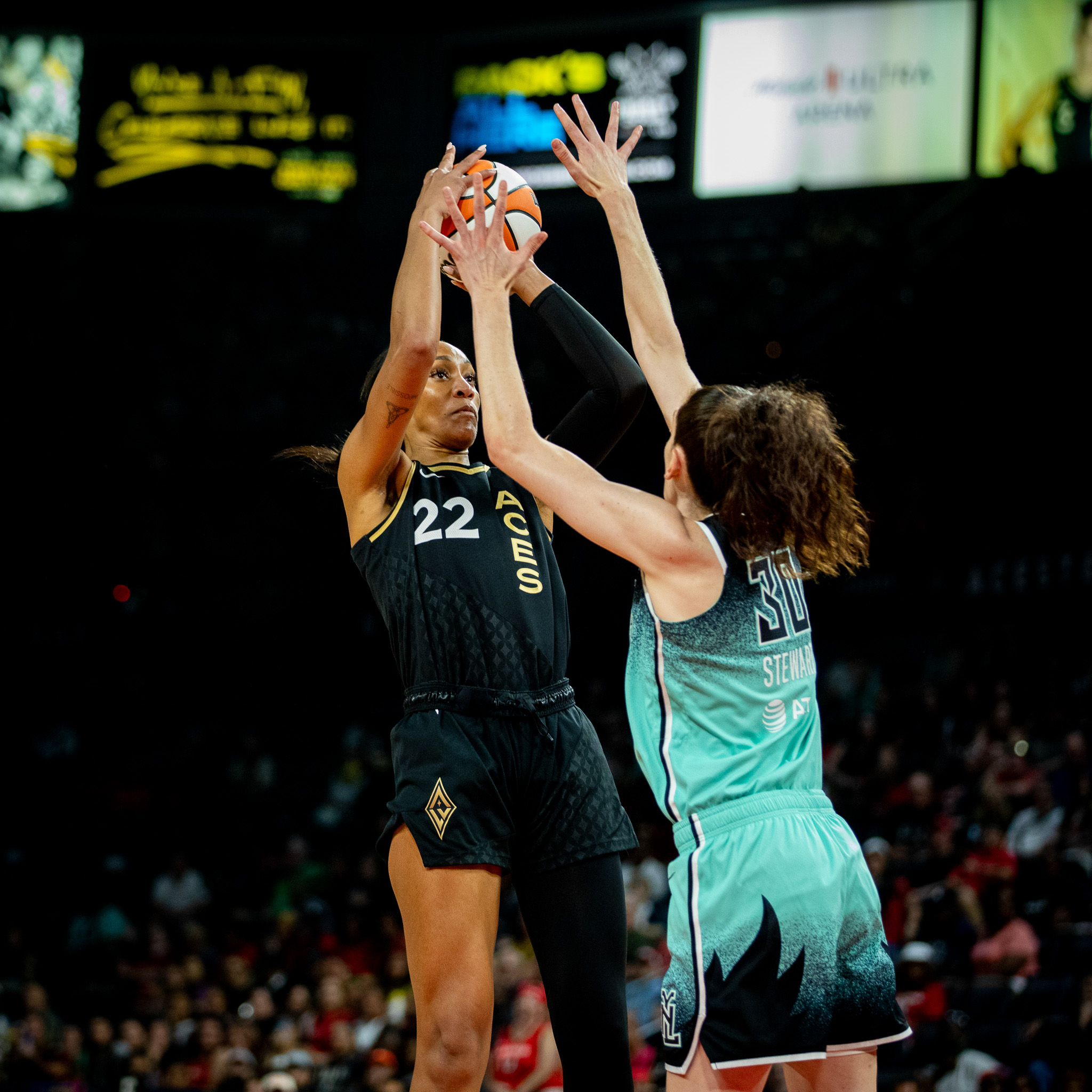 The WNBA’s top two teams slugged it out amid a playoff atmosphere at Mandalay Bay’s Michelob Ultra Arena Thursday as the Las Vegas Aces bounced back from a disappointing Commissioner’s Cup loss to New York two nights ago here with a 88-75 win. Attendance was announced at 9,230 in a very loud arena tonight.