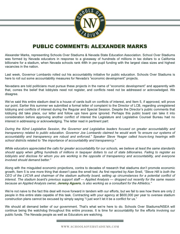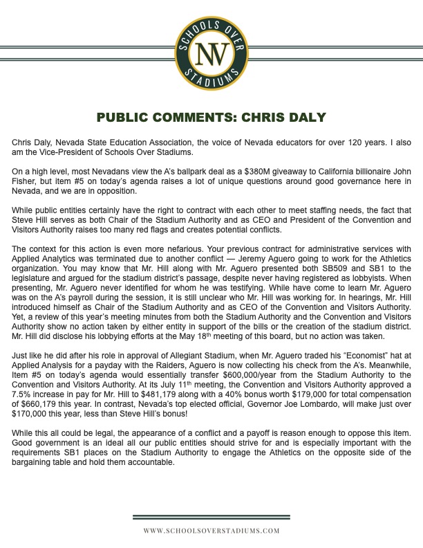 Alex Marks of Schools Over Stadiums and Chris Daly, political director of the Nevada State Education Association, attended the brief stadium board meeting to argue that the hiring of the LVCVA by the stadium board was a clear conflict that has been par for the course in a government process that saw the A’s receive the government money in lightning speed.