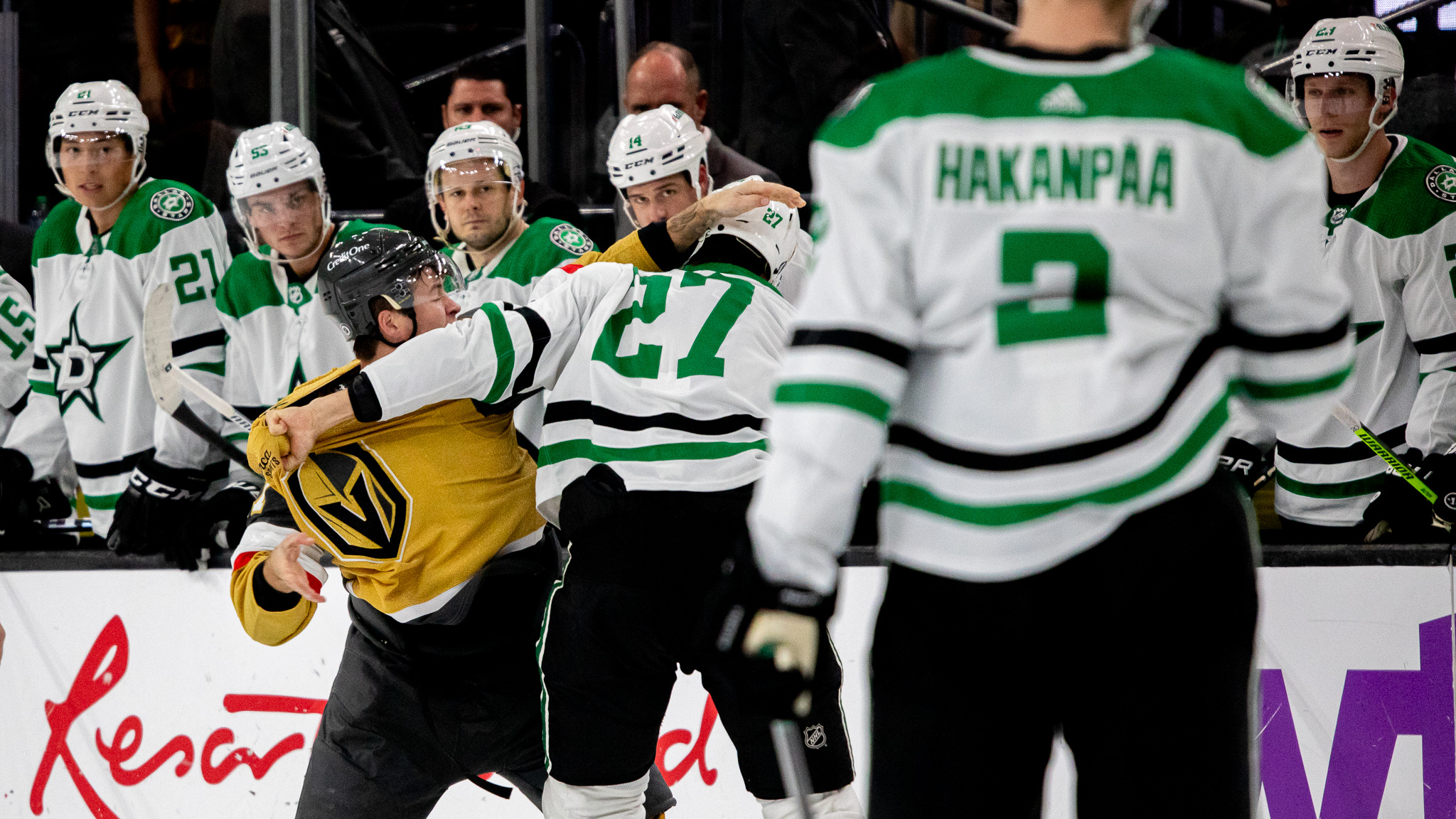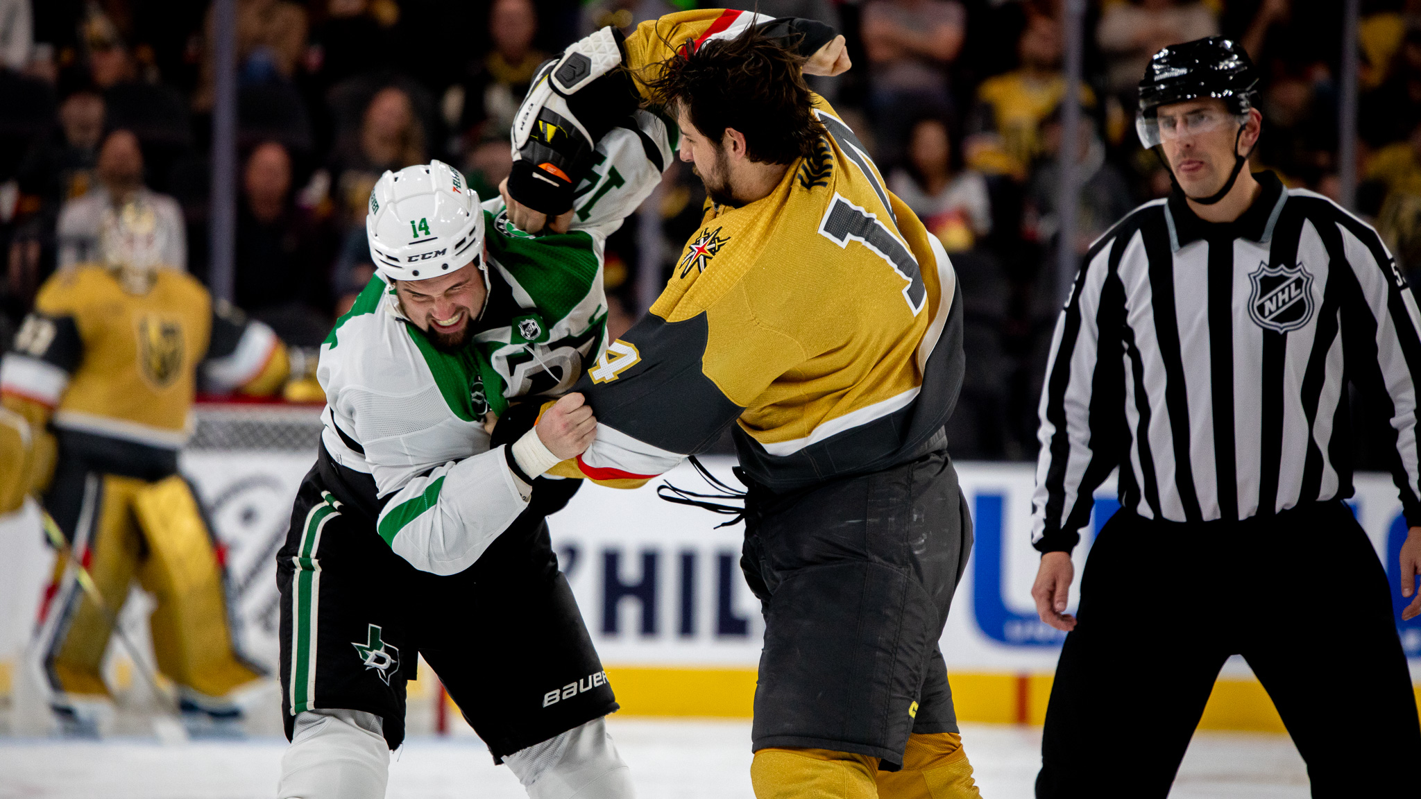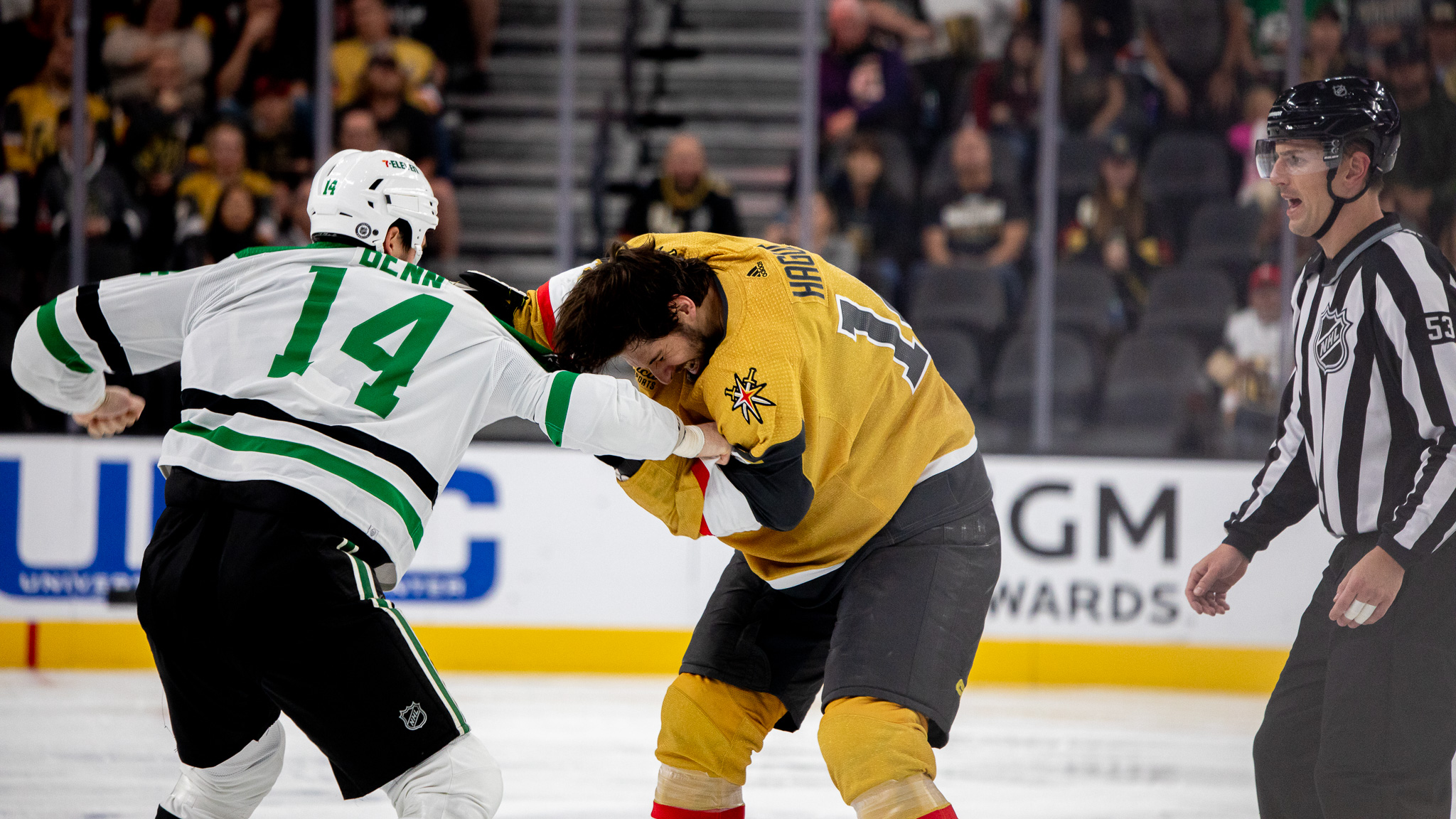 But then the fights came and the game began to feel like a playoff showdown. Nic Hague vs Jamie Benn. Ben “EF” Hutton vs Mason Marchment.