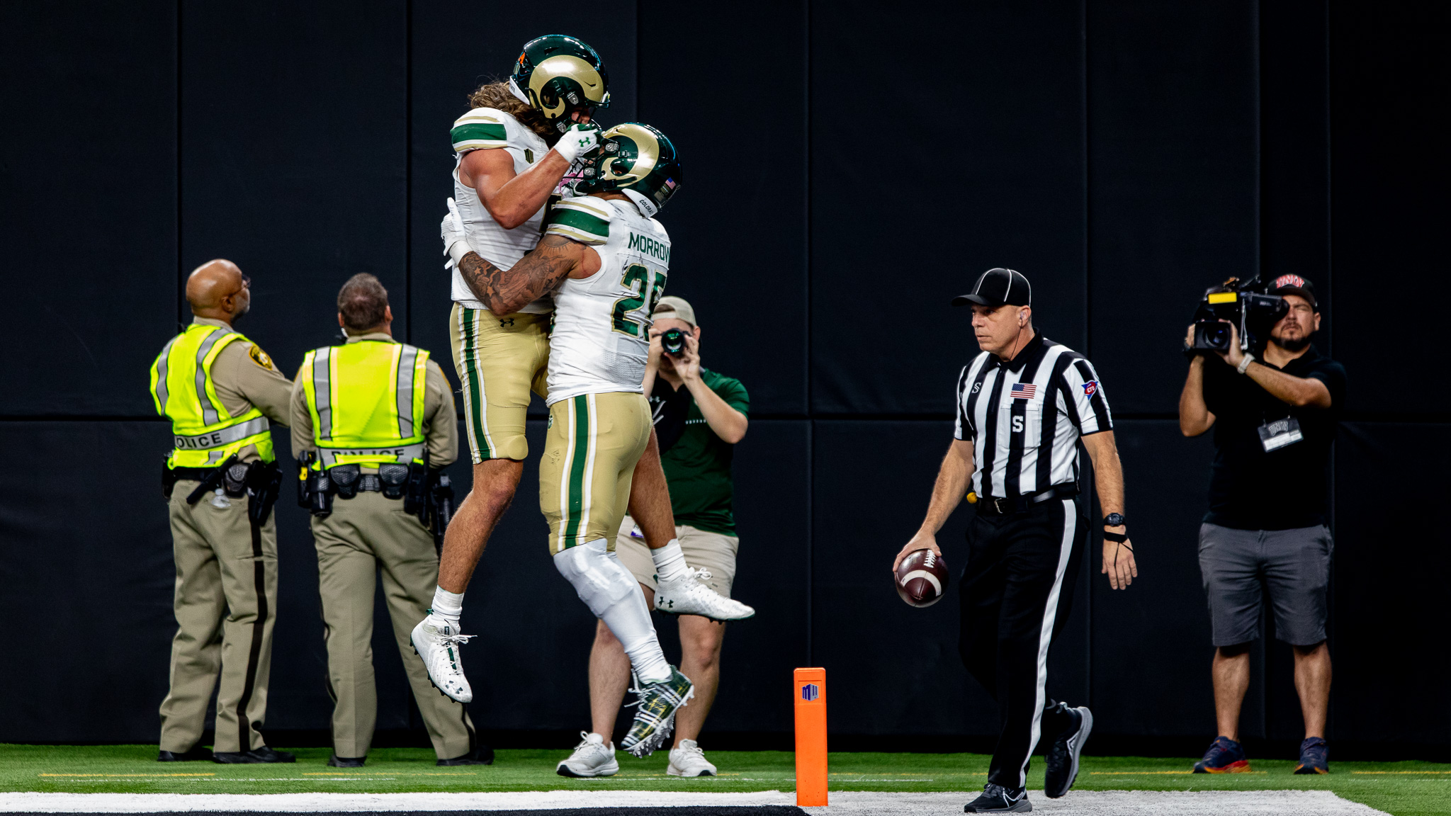 The Rams outgained UNLV, 225 to 175, at the half. The Rebs’ Jayden Maiava completed a long pass on the first half’s last play, but the receiver came up three yards shy of the goal line.