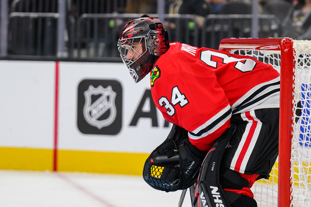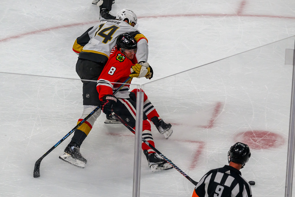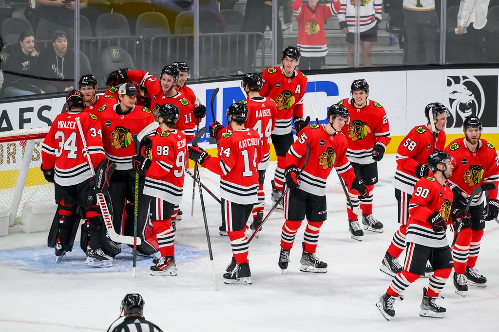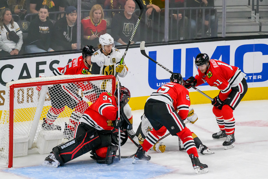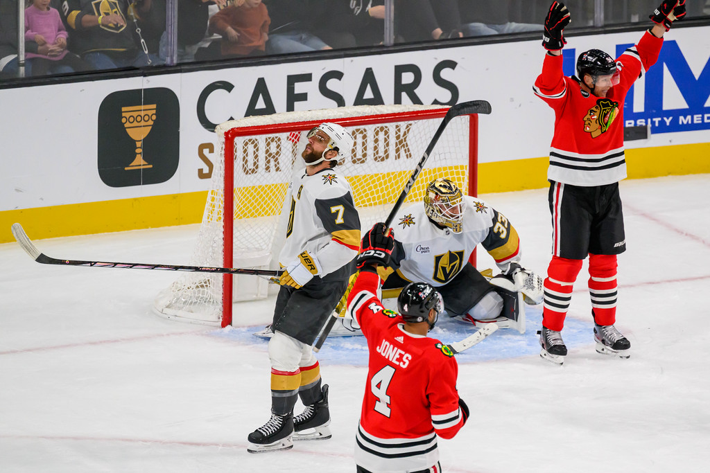 Eventually, the Blackhawks gave the Knights their first loss of the season when the Blackhawks’ Philipp Kurashev scored in OT.