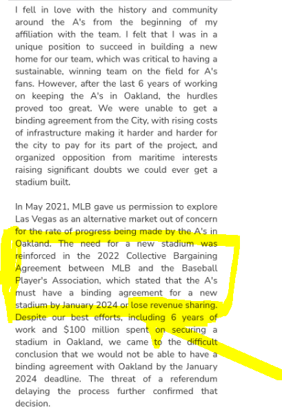 In a letter, Fisher said he would lose revenue sharing money if a stadium deal was not done by 2024. Hello Las Vegas. And just like that, 55 years of history in Oakland — including four World Series championships — were tossed into the Bay for a starry-eyed market that preferred a MLB expansion team over another big league team from Oakland.