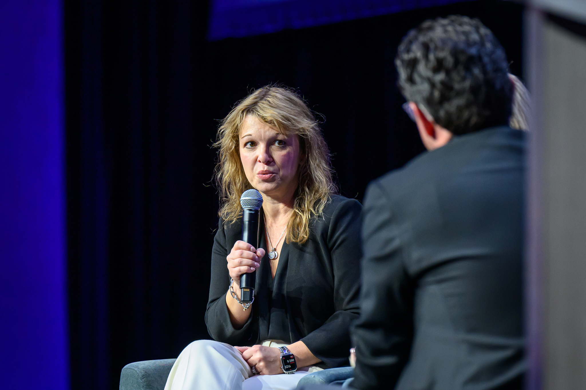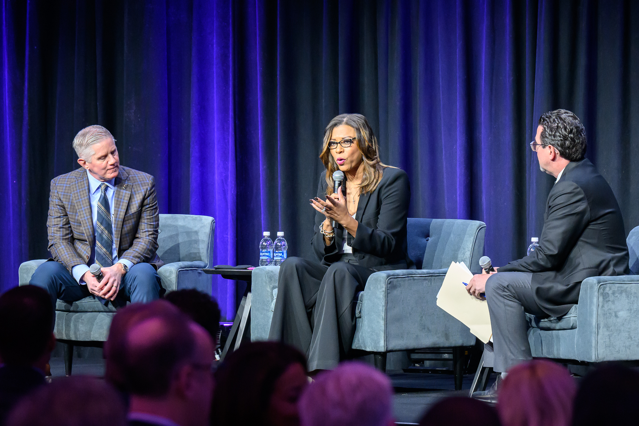 Raiders team president Sandra Douglass Morgan interviewed Goodell and told the crowd that people could ask questions to Goodell on cards on their tables.