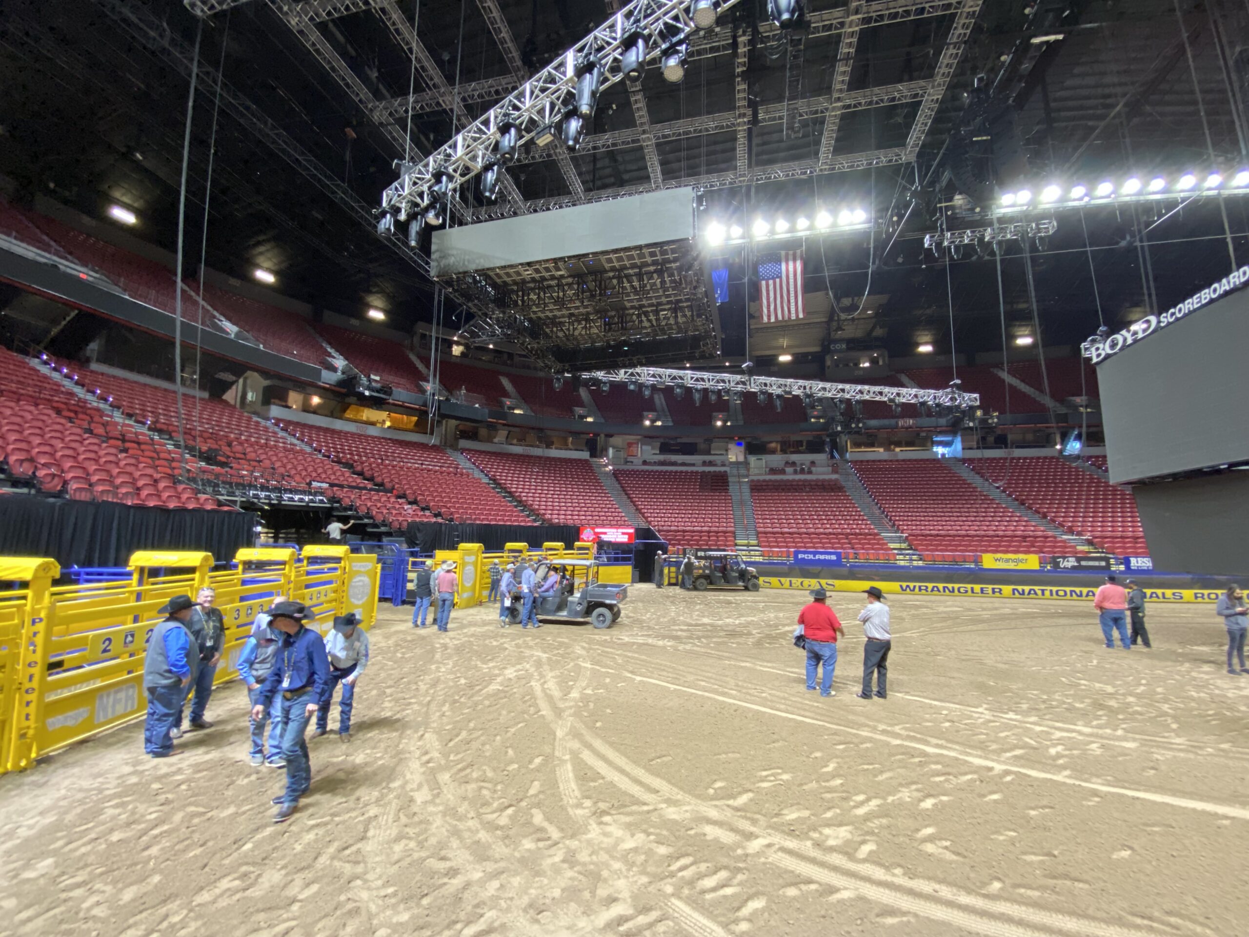 Arena and rodeo workers were setting up equipment for the first day of the National Finals Rodeo, which was scheduled to start Thursday and run through Dec. 16. The NFR promoters have not said what day the rodeo will start.