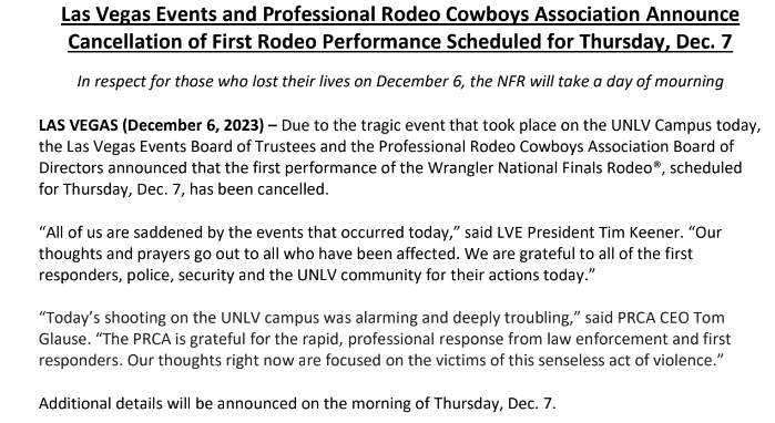 Deadly Shooting On UNLV Campus Prompts Organizers Of National Finals Rodeo To Cancel Thursday’s Opening Performance At UNLV’s Thomas And Mack Center In Las Vegas