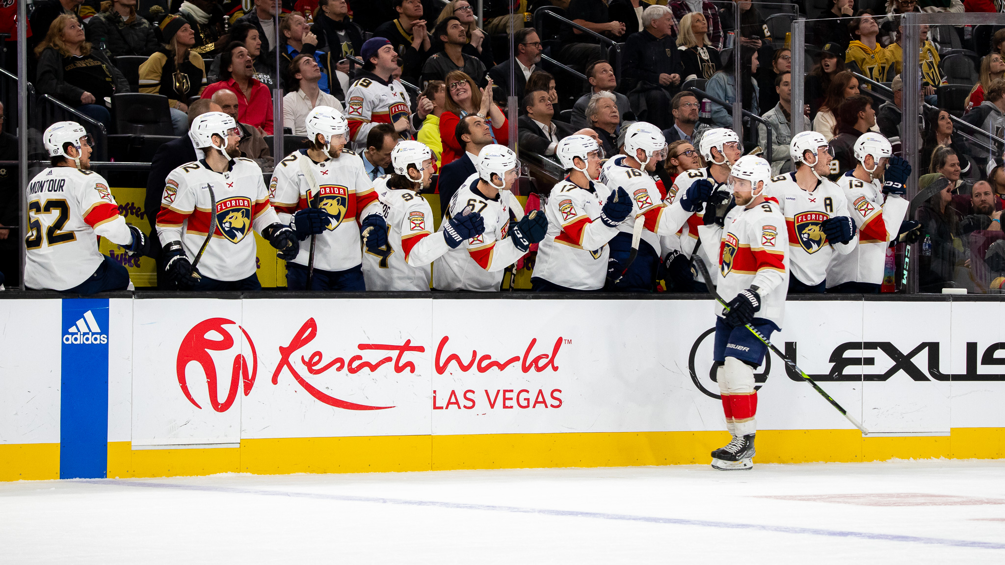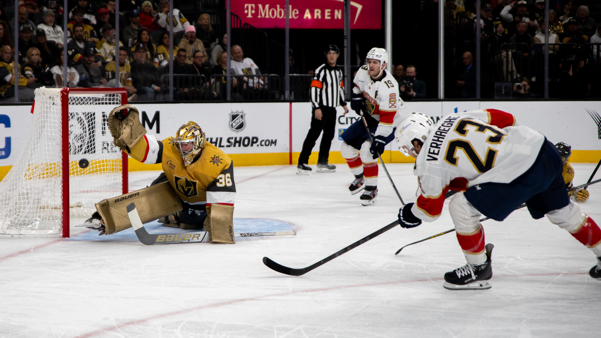 Florida scored its third power play goal of the night in the third period thanks to precision passing that resulted in Sam Reinhart putting the puck past VGK goalie Logan Thompson for a 4-1 Panthers lead.