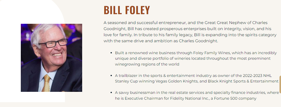 In another sign of mixing the Golden Knights with a Foley liquid product, his new whiskey, Charles Goodnight, is promoted during a Foley-narrated video on the center ice jumbotron between the first and second periods of VGK home games.