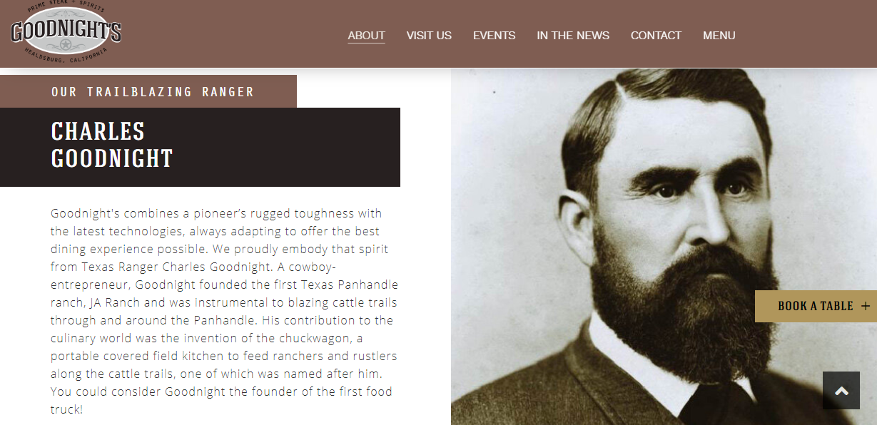 The whiskey is manufactured in Texas and its name, Charles Goodnight, is the same as Foley’s new steak restaurant in Healdsburg, California just north of Santa Rosa. Goodnight was a Texas Ranger and cowboy-entrepreneur in the Texas panhandle who helped create the chuckwagon, a portable field kitchen that fed ranchers in the panhandle.