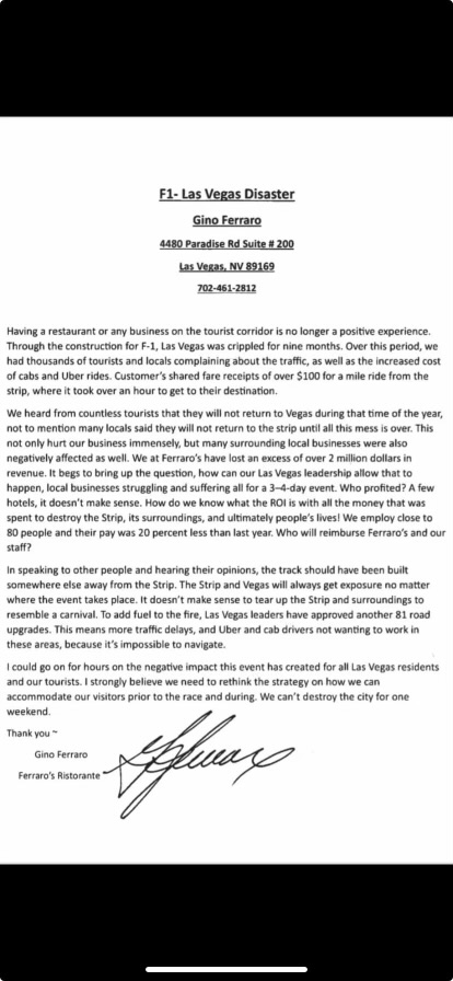 A week ago, Ferraro wrote a letter entitled, “F1-Las Vegas Disaster.”