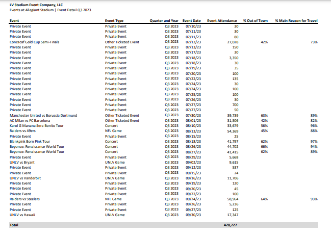 Here’s the attendance for events at the Raiders stadium for July, August and September.