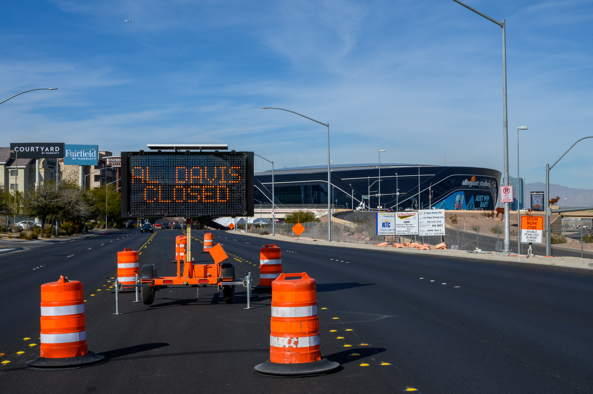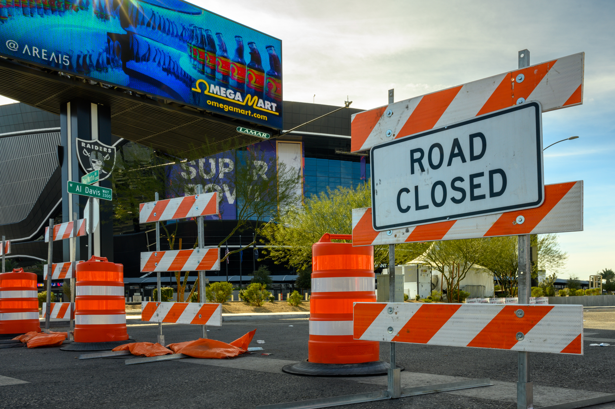 With the Raiders season in the books, the NFL has taken over the 62,500-seat domed stadium — and the “road closed” and Super Bowl signs are sprouting all over the stadium area on the west side of Interstate 15 across from Mandalay Bay hotel-casino-convention center.