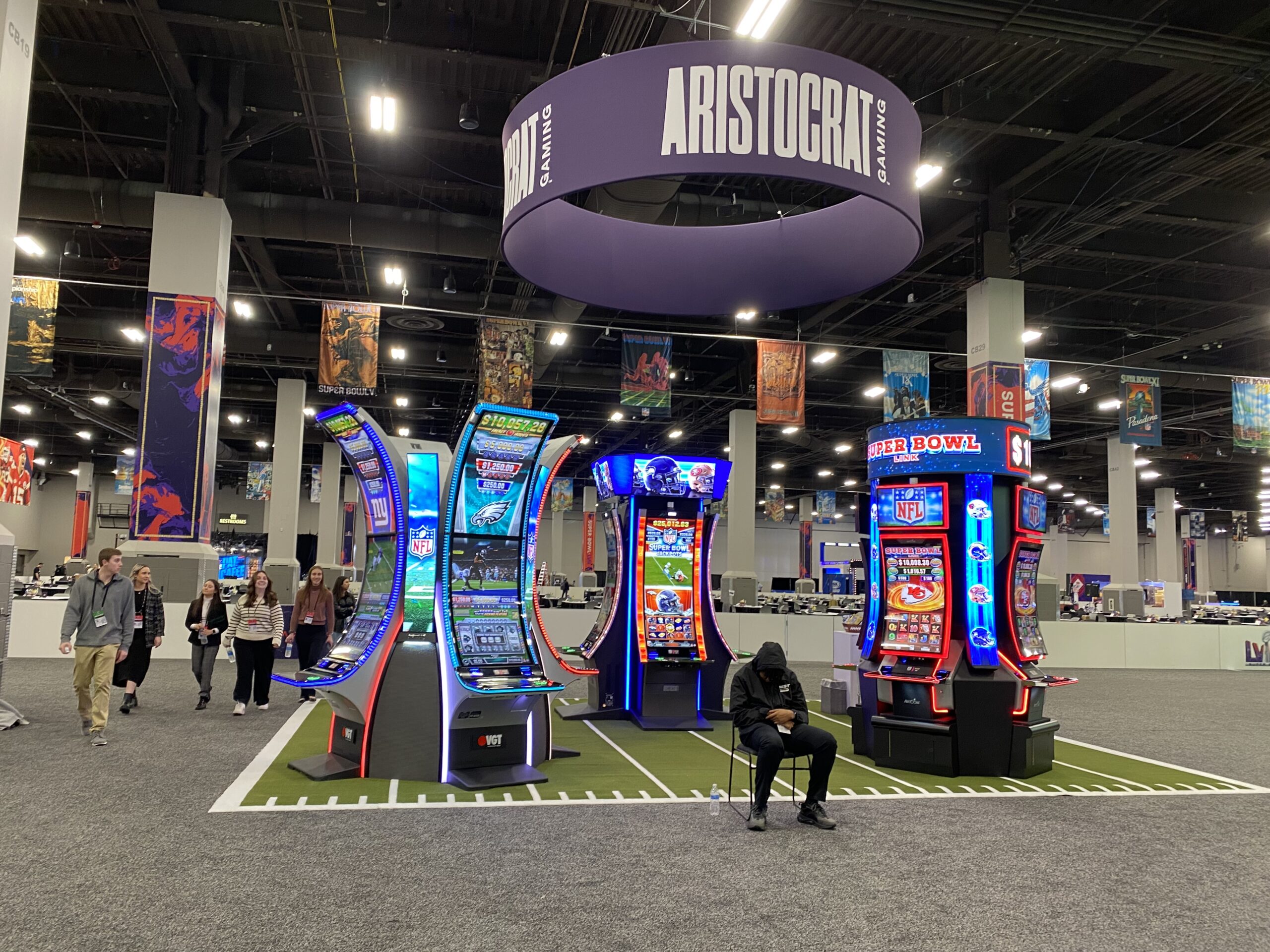 Even gambling machine manufacturer Aristocrat had its NFL-theme slot machines on display in the radio row room.