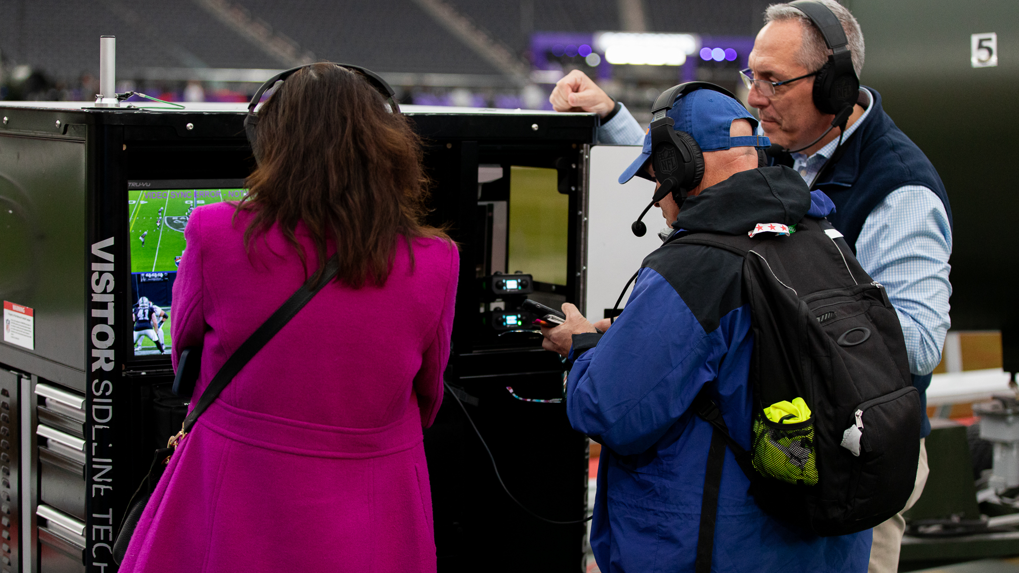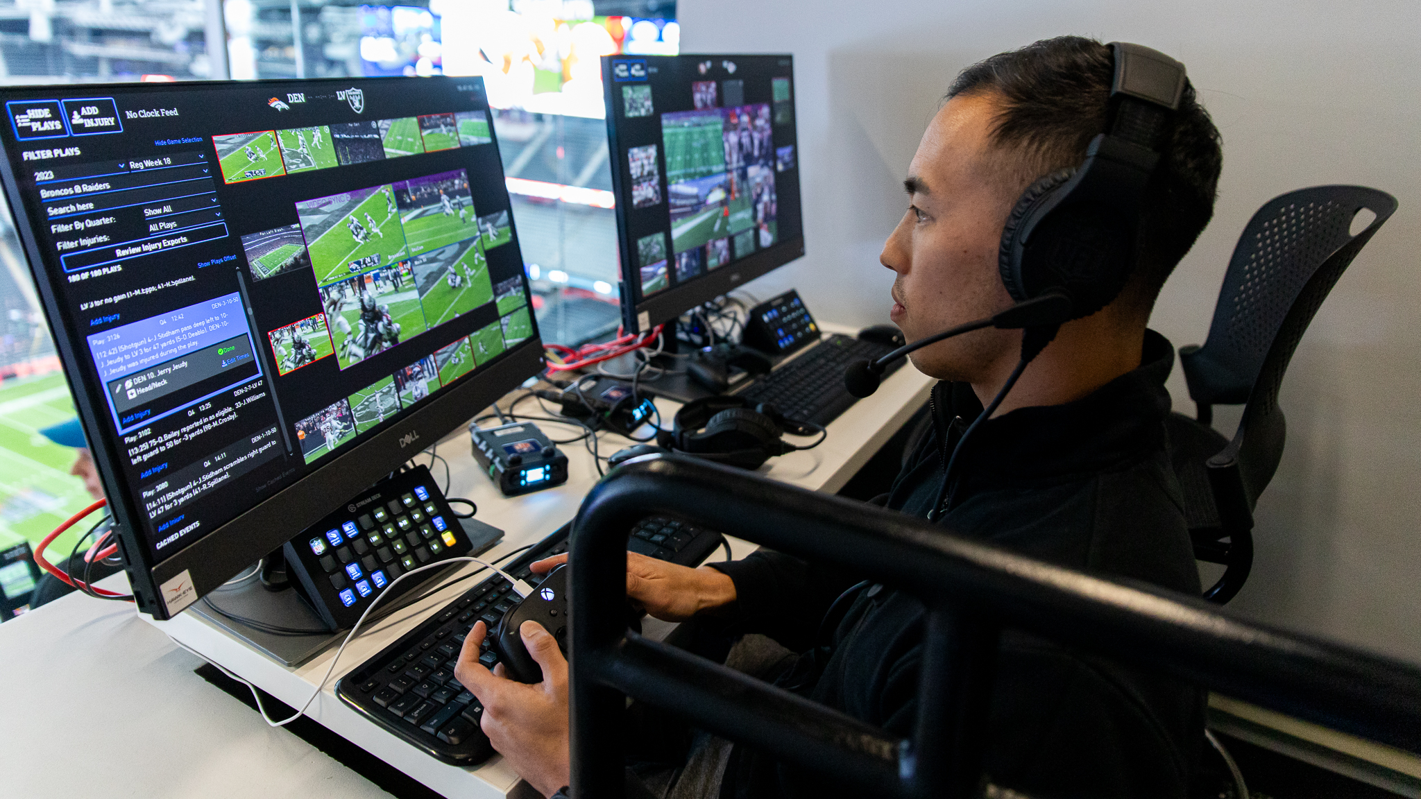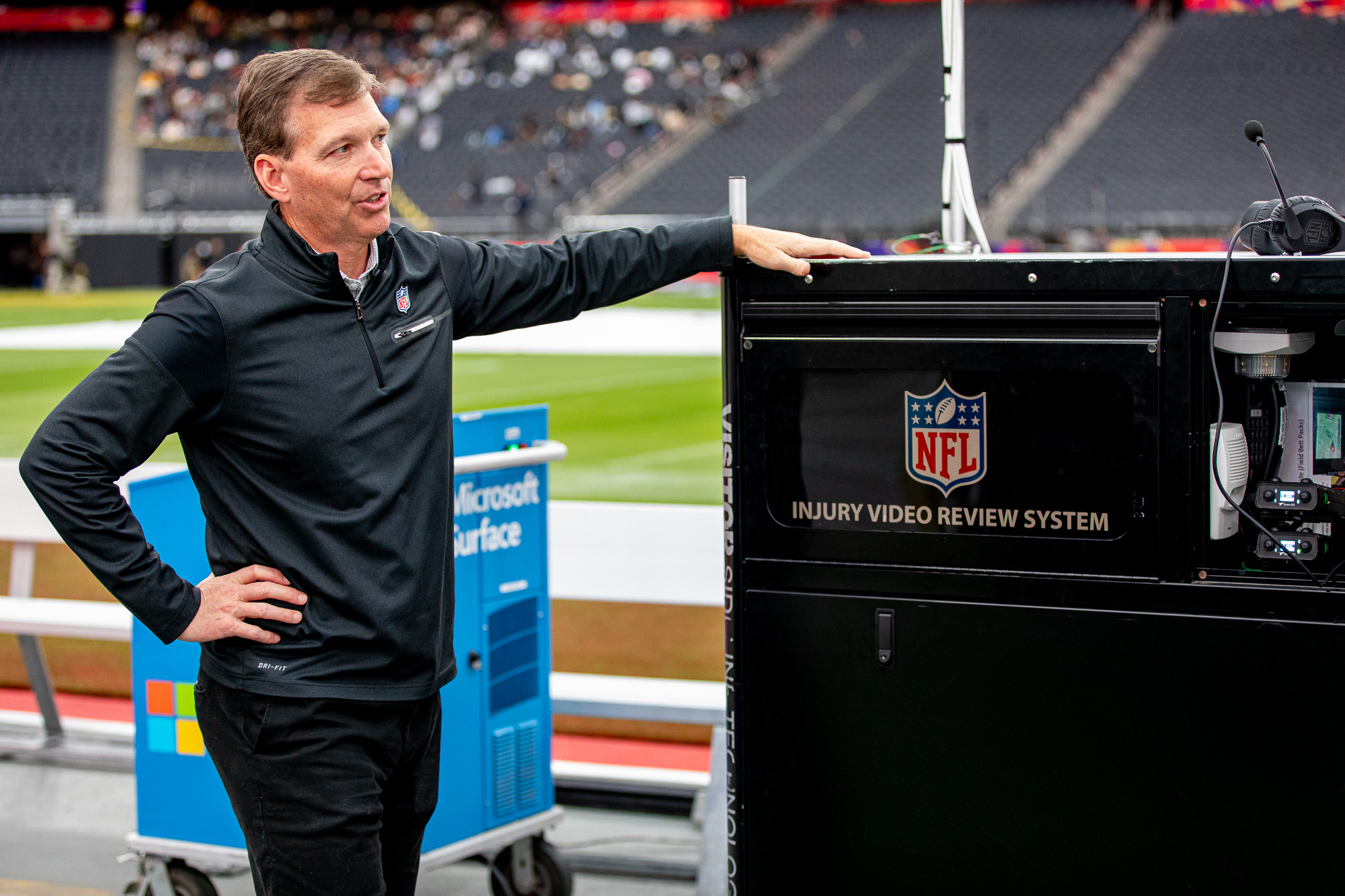 Sills, along with Jeff Miller, executive VP overseeing health and safety, led a tour that included pit stops in Allegiant Stadium’s injury video replay booth at the press box level and a field-level injury video review machine where the operators at both sites are in constant communication.
