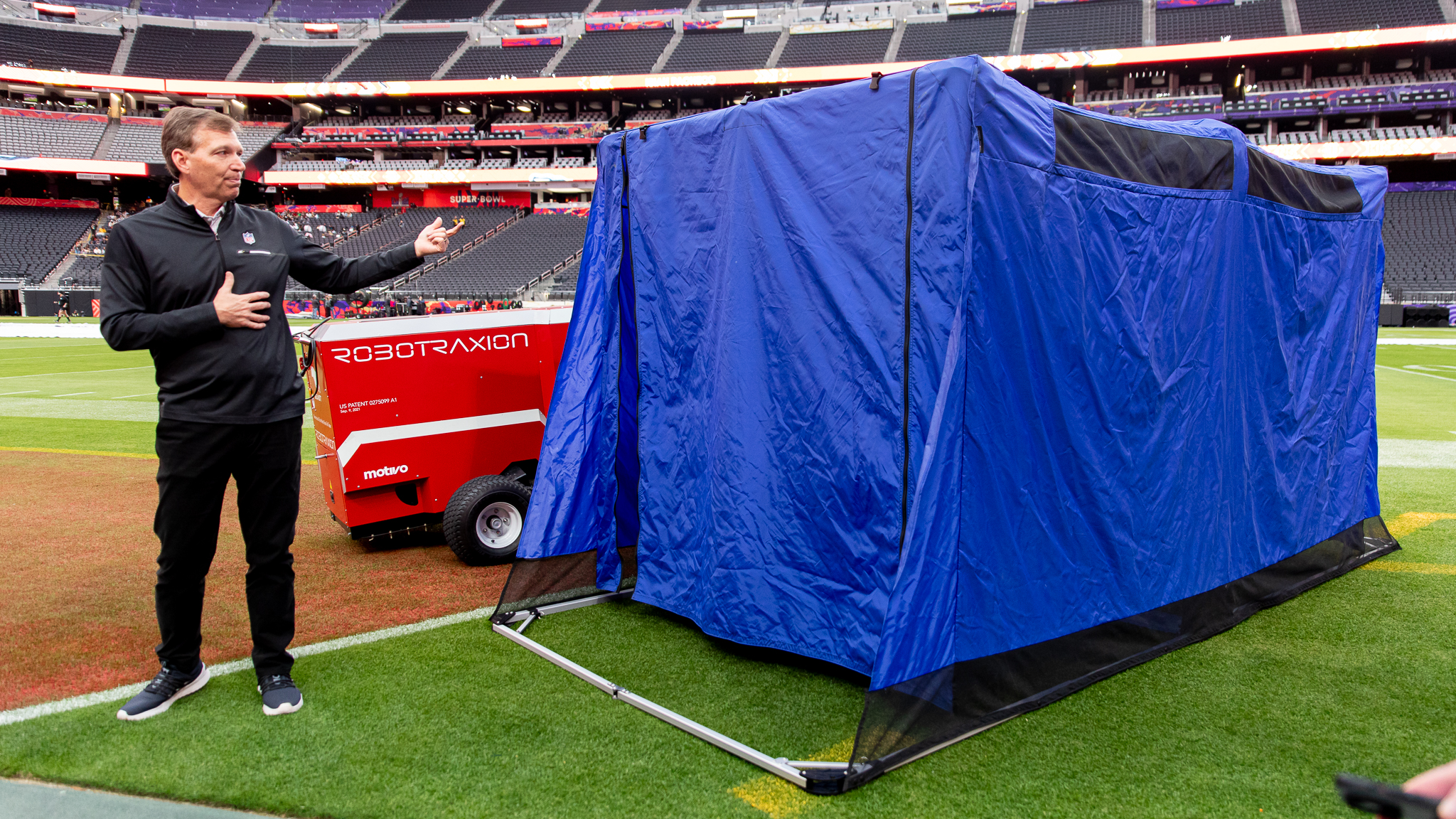 There are three blue tents in every NFL stadium, one for each team and a backup.