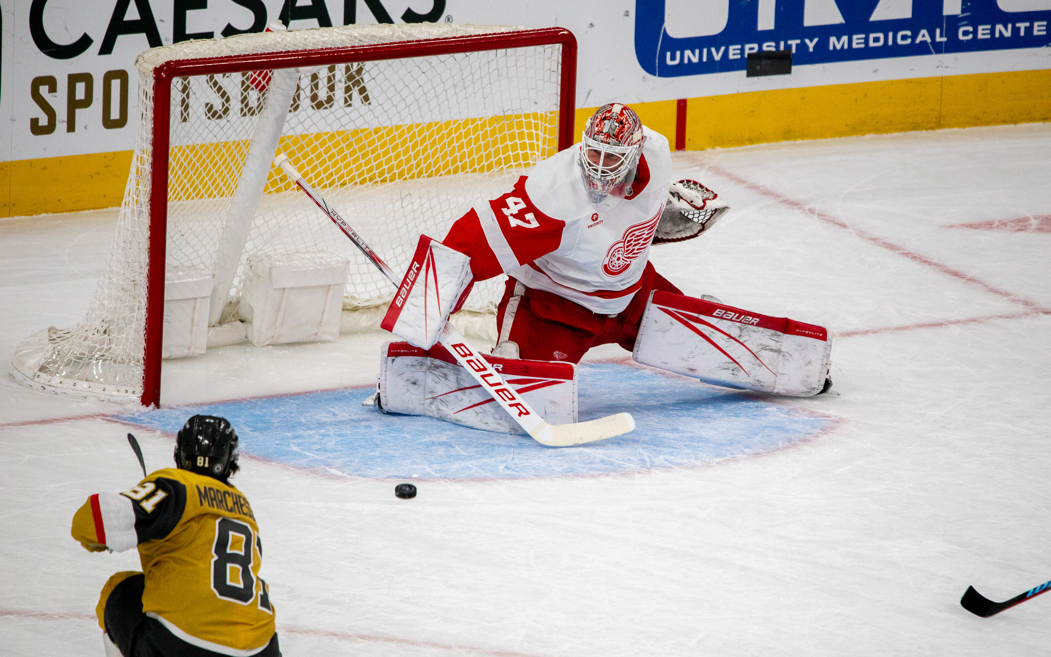 Story line: Golden Knights peppered Detroit goalie James Reimer with 20 shots in the opening period. The VGK outshot Detroit, 32-13, after two periods. And Marchessault’s hat trick salted away the win after his empty-netter.