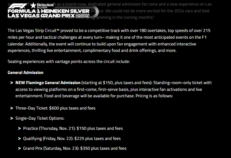 The F1 Las Vegas race heard the criticisms of the expensive tickets for the first race four months ago and has tried to make ticket prices more affordable for the Nov. 21-23 event. There’s a new $350 ticket for the grand prix race day. “We intentionally created two new GA fan zones, adding over 7,000 more GA tickets to ensure fans had access to the entry-level product. We also made sure Nevada residents were the first to be able to access this new offer,” a F1 Las Vegas spokesperson said.