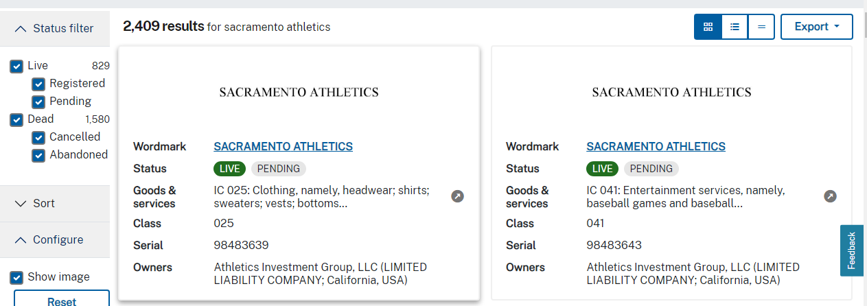 But a look at the Trademark Search showed some active cases that include “Sacramento Athletics.”