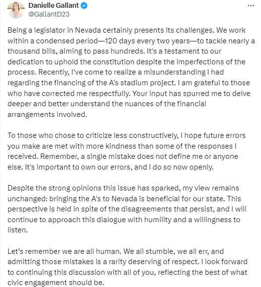 So, she responded: “Recently, I’ve come to realize a misunderstanding I had regarding the financing of the A’s stadium project. I am grateful to those who have corrected me respectfully. Your input has spurred me to delve deeper and better understand the nuances of the financial arrangements involved.”