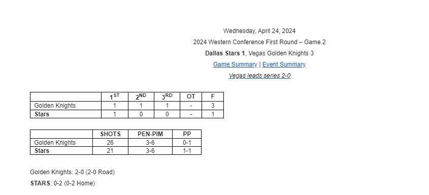 Just the facts: Vegas Golden Knights 3 Dallas Stars 1