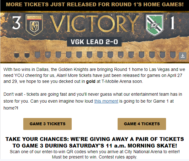 Golden Knights Contact Fans Friday To Say Vegas-Dallas Playoff Tickets Released For Games 3 and 4, Saturday and Monday