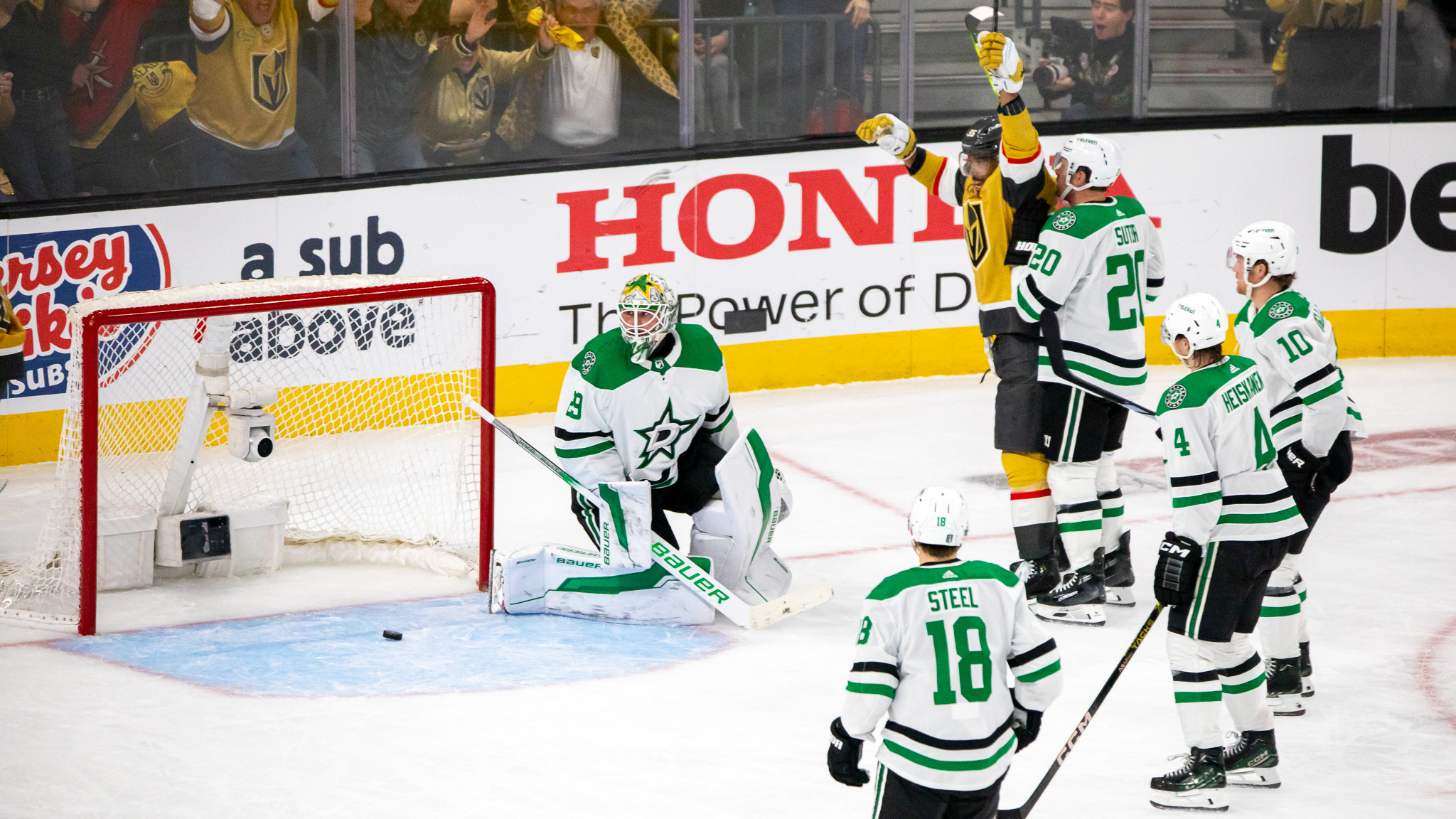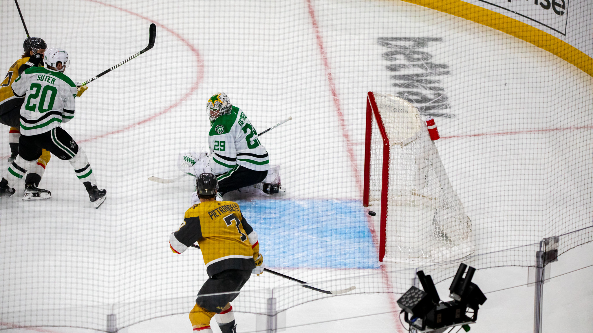 Stone scored an empty-netter the length of the ice and the Knights and Stars will decide things Sunday in Texas.