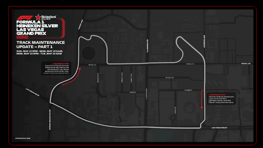 More than six months before the Las Vegas Grand Prix’s Nov. 21-23 race event, Formula 1 organizers are scheduled to start lane reductions along the 3.8-mile course in the busy Strip corridor from May 12-15.