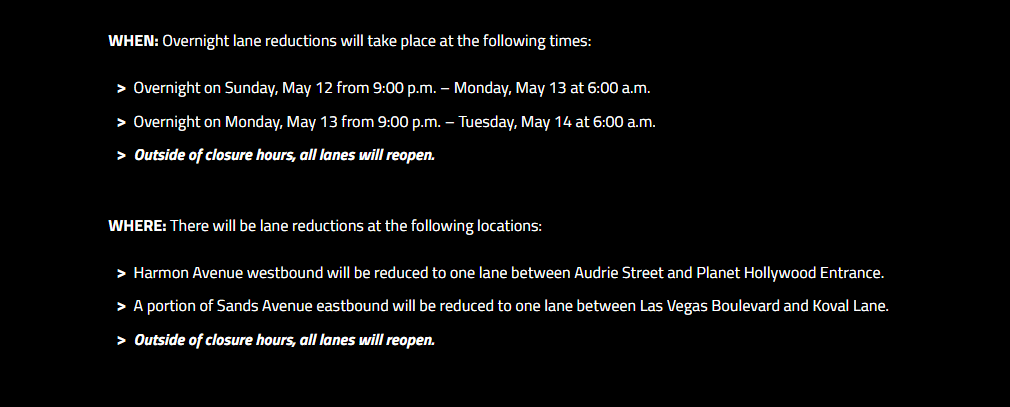 In this particular case of next week’s lane closures, “This work is related to 2023 race road permits and not for the upcoming 2024 race,” Clark County spokesperson Jennifer Cooper told LVSportsBiz.com Friday.
