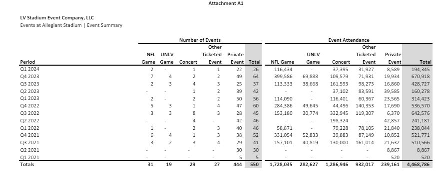 The stadium board also took a look at the Raiders stadium’s activity for the first quarter of 2024: two NFL games including Super Bowl 58, a concert and a rugby match. Plus there were 22 private events inside the stadium like corporate gatherings.