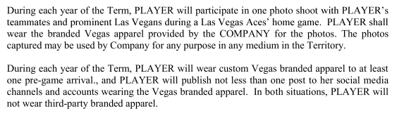 An interesting point in the contract is if the sponsorship “conflicts with or is inconsistent” with either the WNBA’s collective bargaining agreement or the “Player’s Standard Player Contract,” then the $100,000 agreement is off.