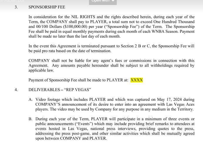 The contract shows the sponsorship is for two years, so the LVCVA is paying out $2.4 million to Aces players through the 2025 season.