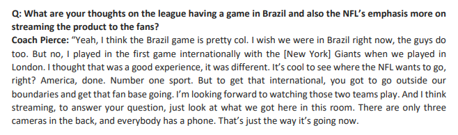 Then LVSportsBiz.com asked Pierce about the NFL game in Brazil between the Eagles and Packers and his thoughts on the league moving to more streaming.