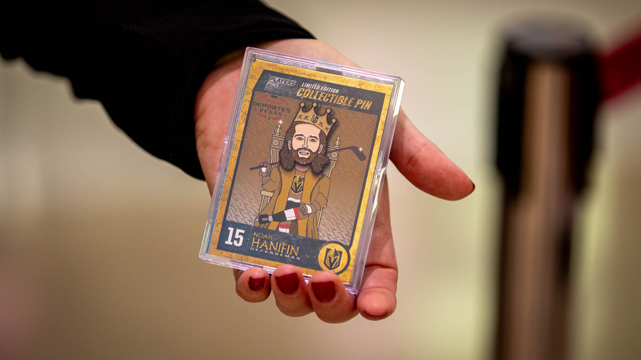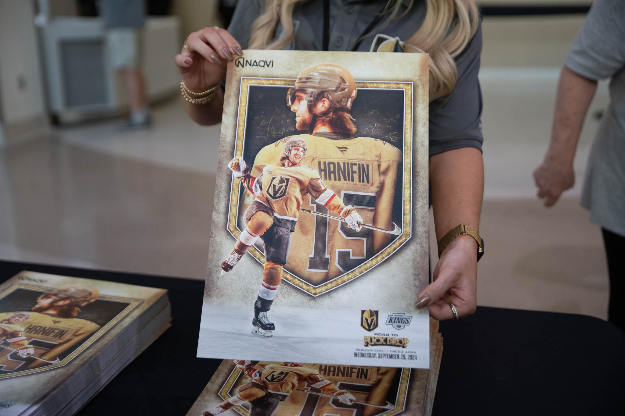 The Knights hand out sets of freebie promotions to fans in the preseasons like coins and player busts. For this year, it’s a pin set with defenseman Noah Hanifan featured tonight.
