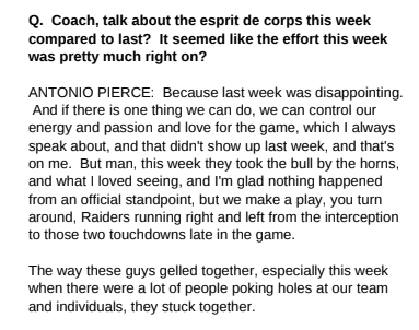 This week against Cleveland, the Raiders players showed more heart and grit than last week. Pierce was happy with the team’s efforts. Here was the LVSportsBiz question: