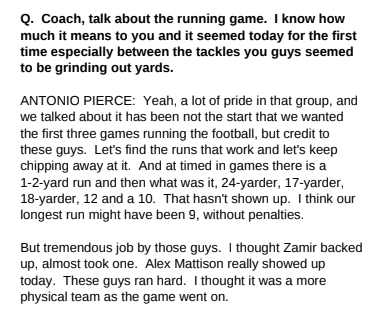 In response to an LVSportsBiz question about the Raiders’ running game, Pierce said he was pleased that Raiders runners like Zamir White and Alexander Mattison ran hard and began ripping off runs of more than ten yards. The Raiders ran for 152 yards, easily the most rushing yardage for a game this season. LVSportsBiz asked Pierce about the running game during the postgame presser: