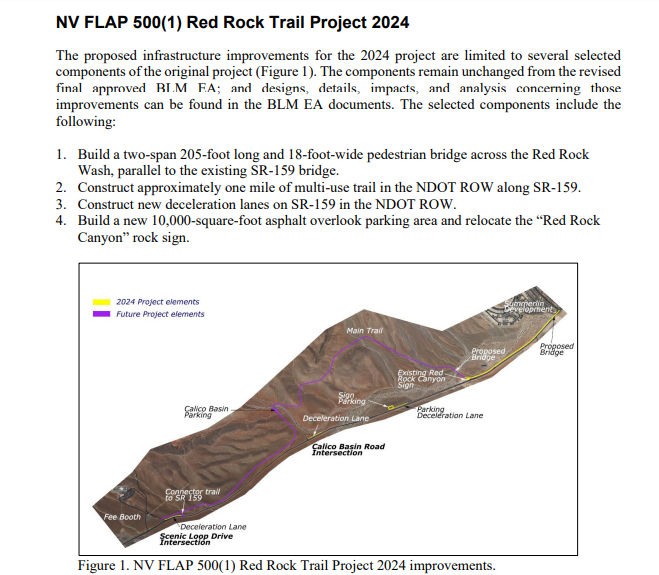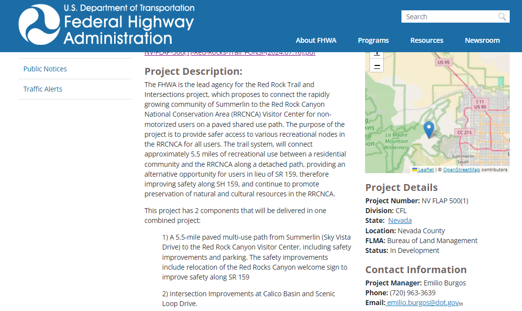 The paved trail is badly needed because of dangerous motorists on State Road 159, which connects the fast-growing Summerlin suburb outside Las Vegas with the very popular Red Rock National Conservation Arena and its toll-use Red Rock “loop.”