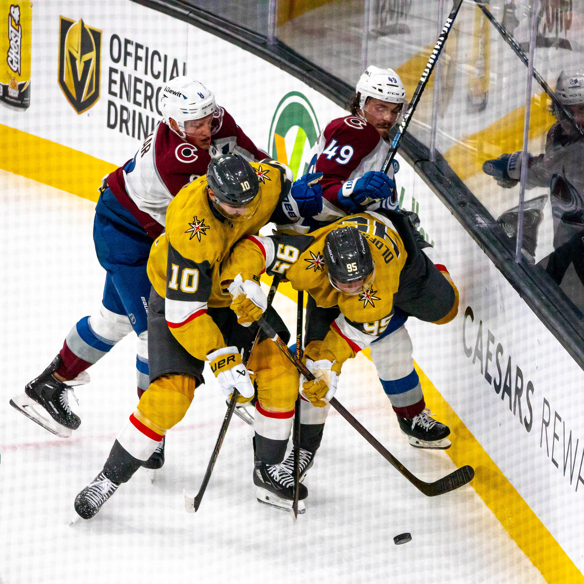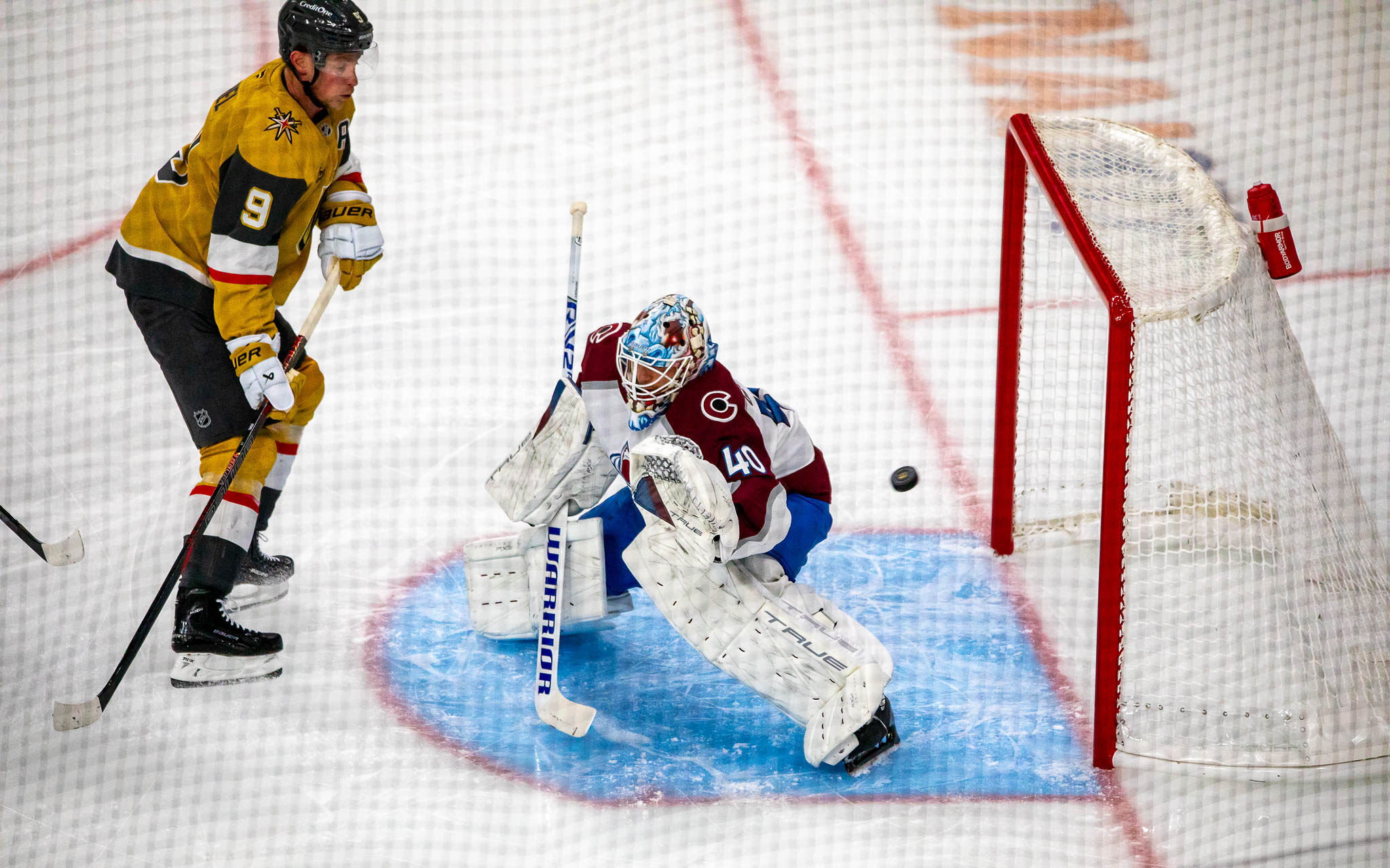 Colorado’s Casey Mittelstadt scored off a rebound to slide the puck by VGK goalie Adin Hill.