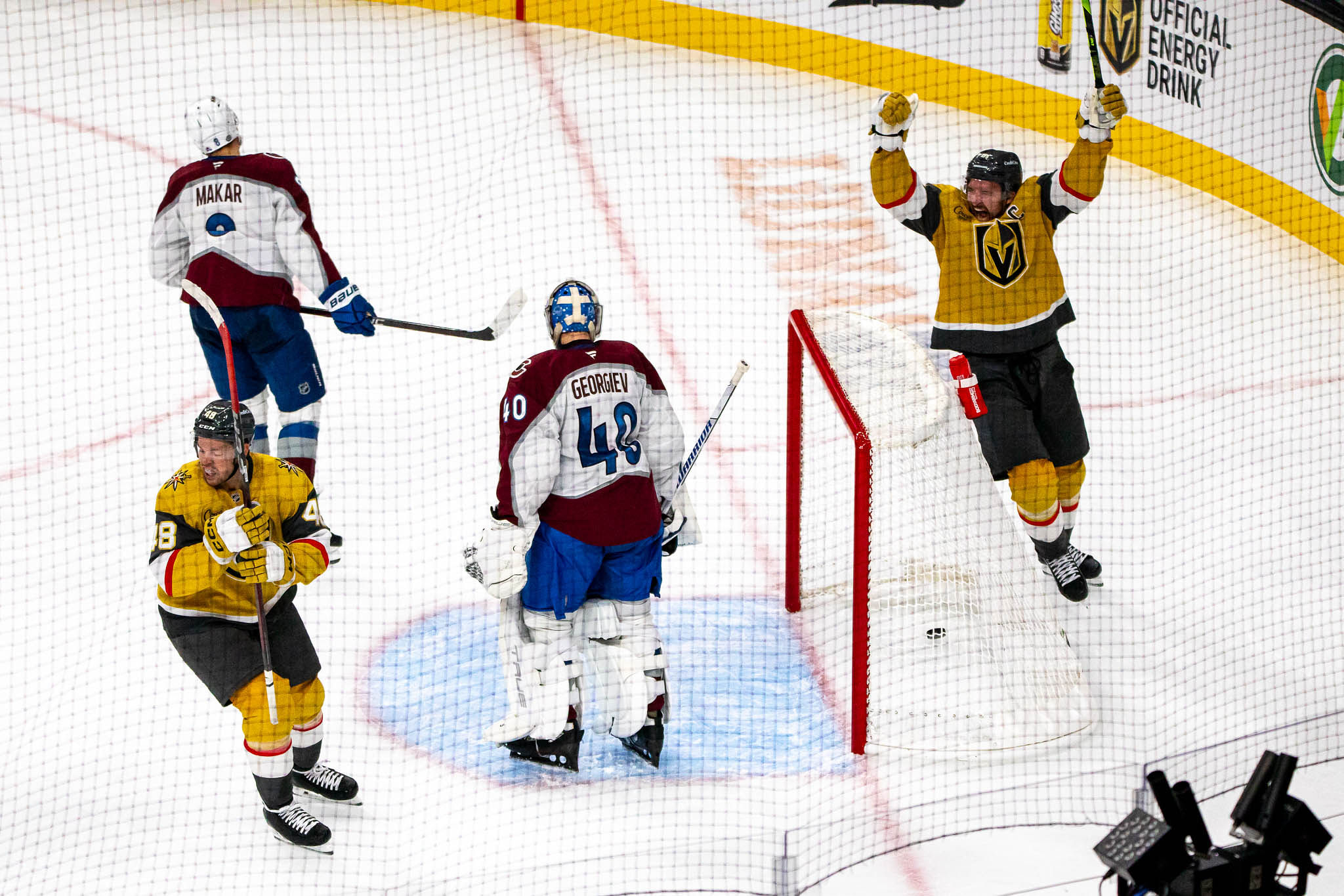 But Knights defenseman Zach Whitecloud matched that second period goal by taking a feed from that man Eichel and snapping a wrist shot past Avs goalie Alexander Georgiev to restore the Golden Knights’ two-goal lead.