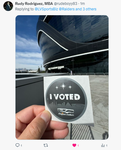 Southern Nevada contributed $750 million in public dollars to help the Raiders build the domed stadium on the west side of I-15 across from the Mandalay Bay hotel-casino. Nevada Secretary of State Cisco Aguilar told LVSportsBiz.com at the stadium site that he thought the high profile of an NFL stadium hosting a polling site helped draw more residents to vote.