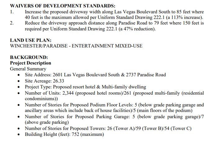 As you can see from the county’s backup material, LVXP wants to build 2,344 hotel rooms and 261 condominium units on the 26.33-acre site on the east side of the Strip just south of Sahara Avenue. The building height is 752 feet.