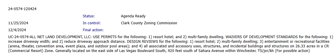 For the record, the Clark County commissioners, acting as zoning commissioners, Wednesday waived some development standards like increasing the proposed driveway width along Las Vegas Boulevard related to the proposed arena project.