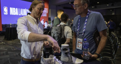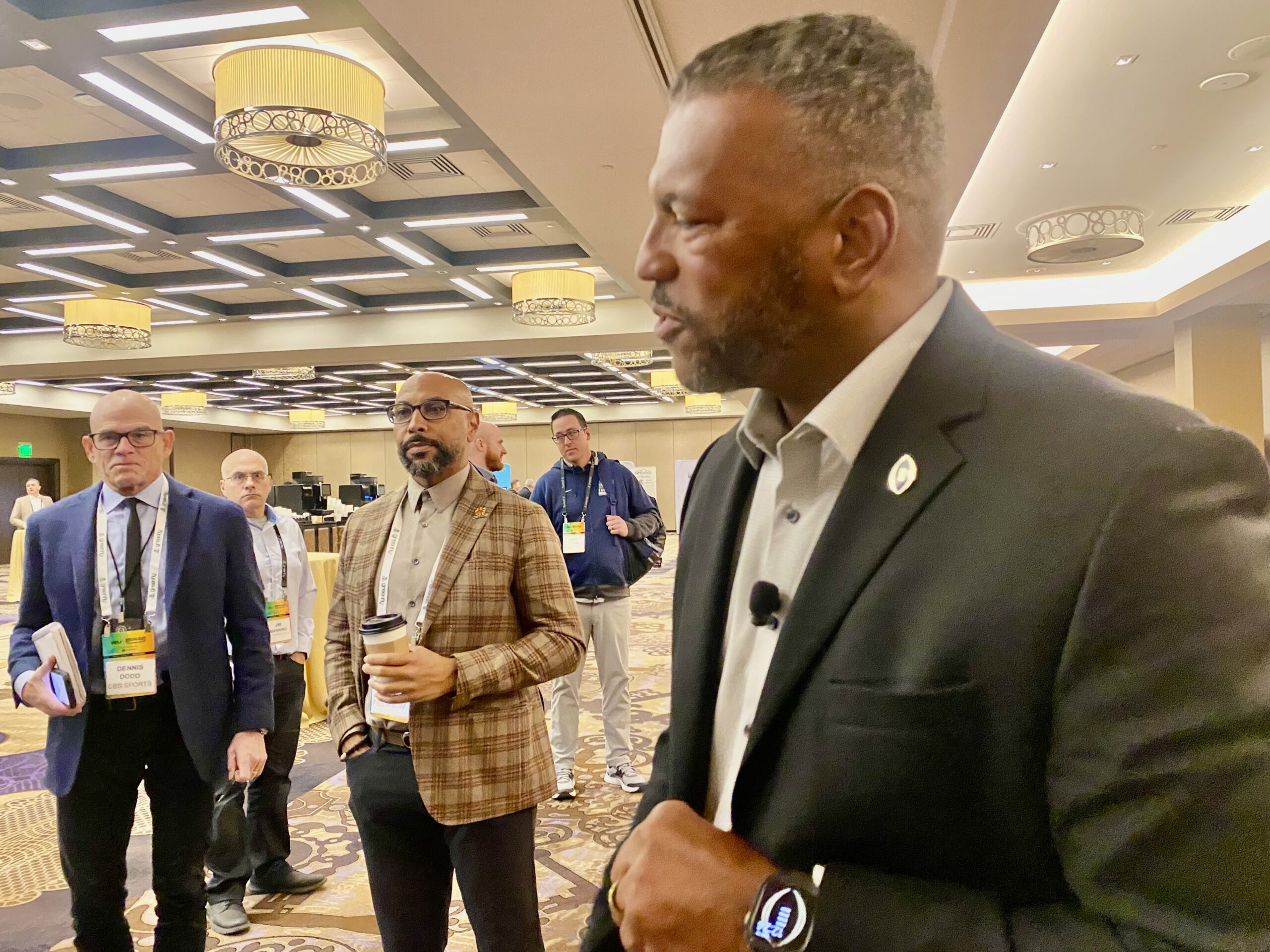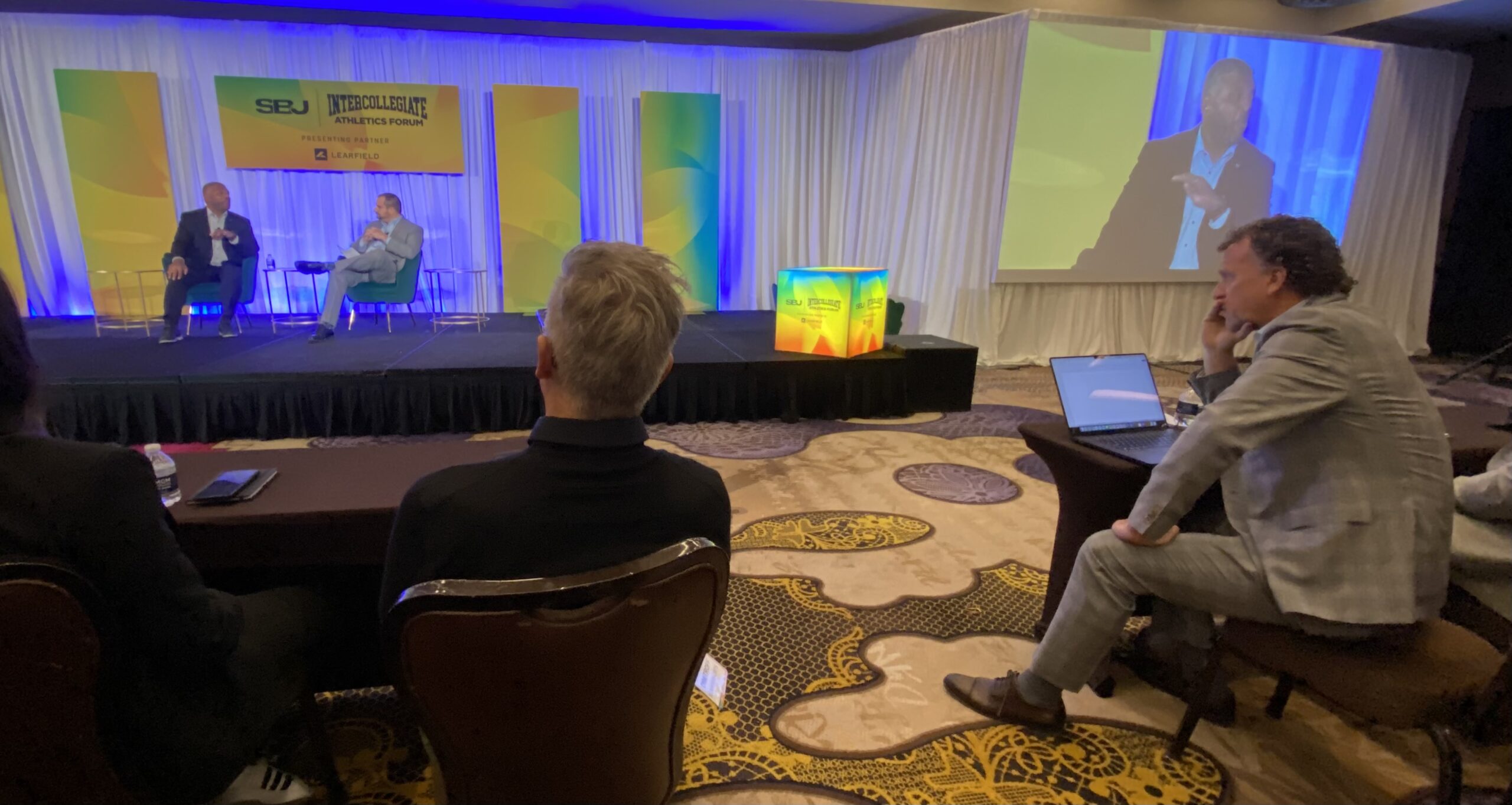 Sports Business Journal Publisher Abe Madkour, pictured above on the right watching Rich Clark, said 580 attendees were in the SBJ conference system.