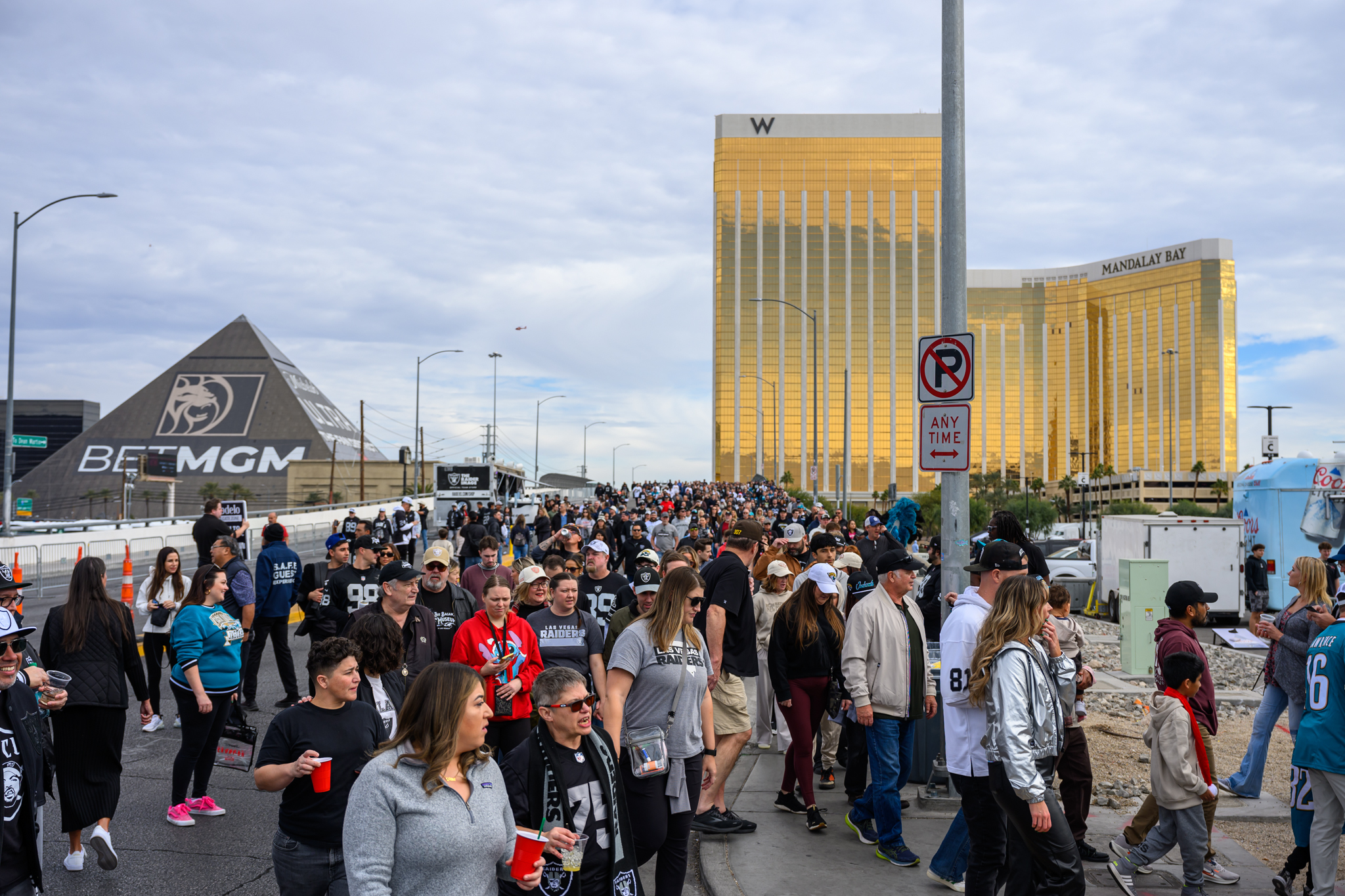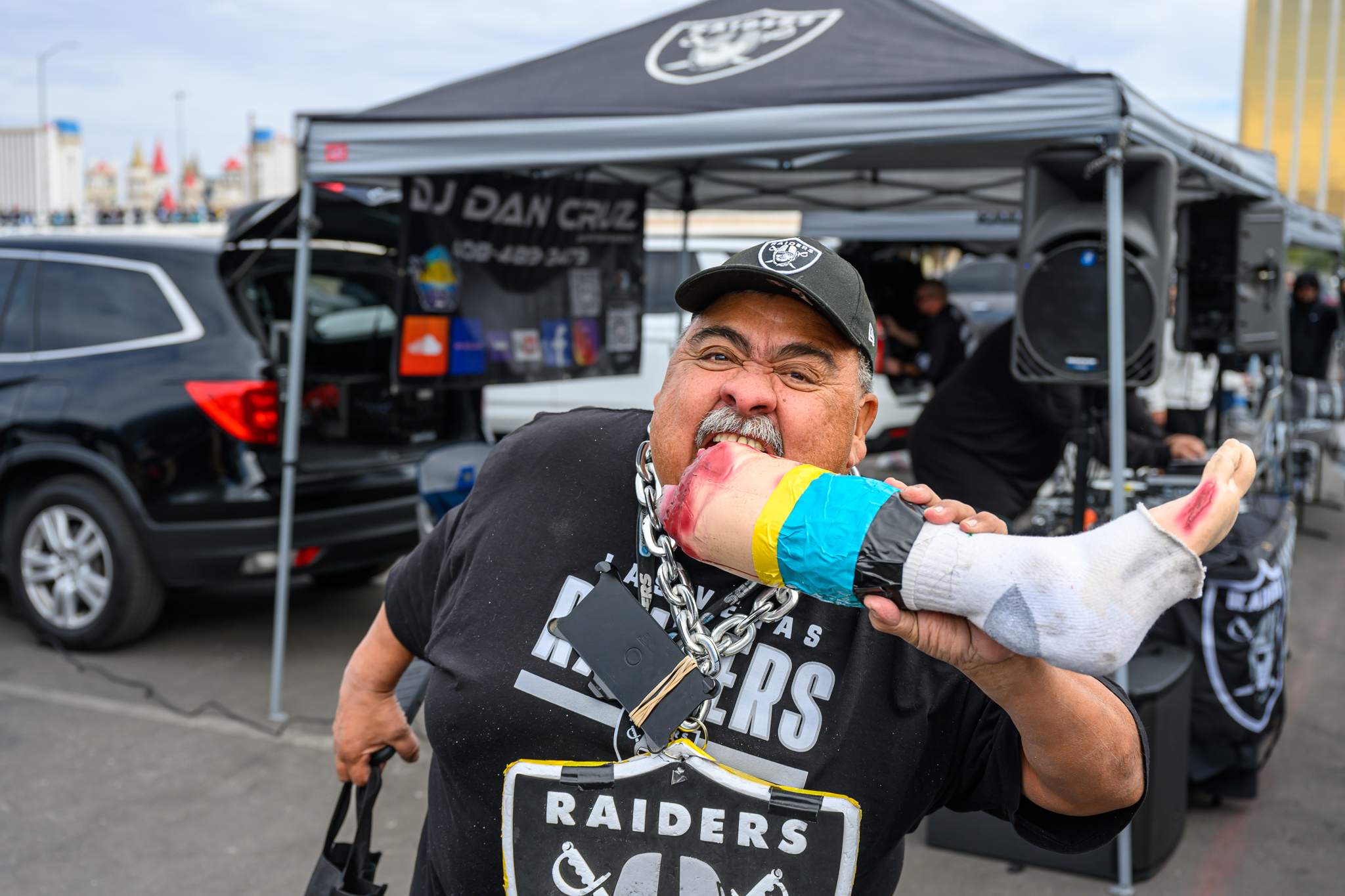 “My dogs have the TV clicker back in the motel room,” Coronado joked to LVSportsBiz.com before today’s Raiders-Jaguars game. He parks his bus in the stadium parking lot on the north side of the stadium, not too far from the venue’s main entrance and team store, the Raider Image.