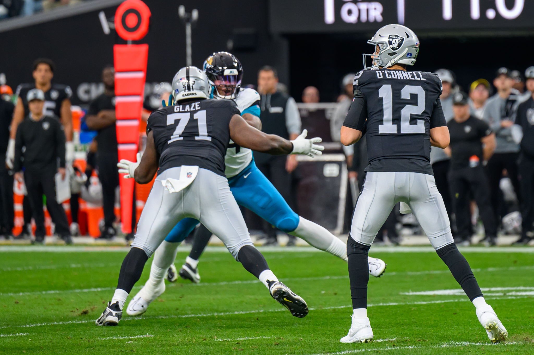The Jags’ quarterback, Mac Jones, found a wide open Brian Thomas for 62 yards and the quarter ended with the Raiders trailing, 14-13.
