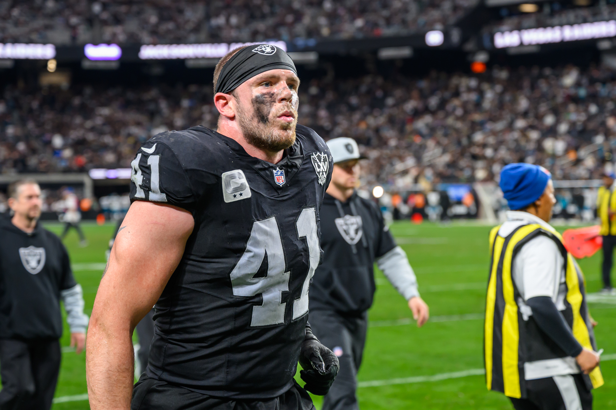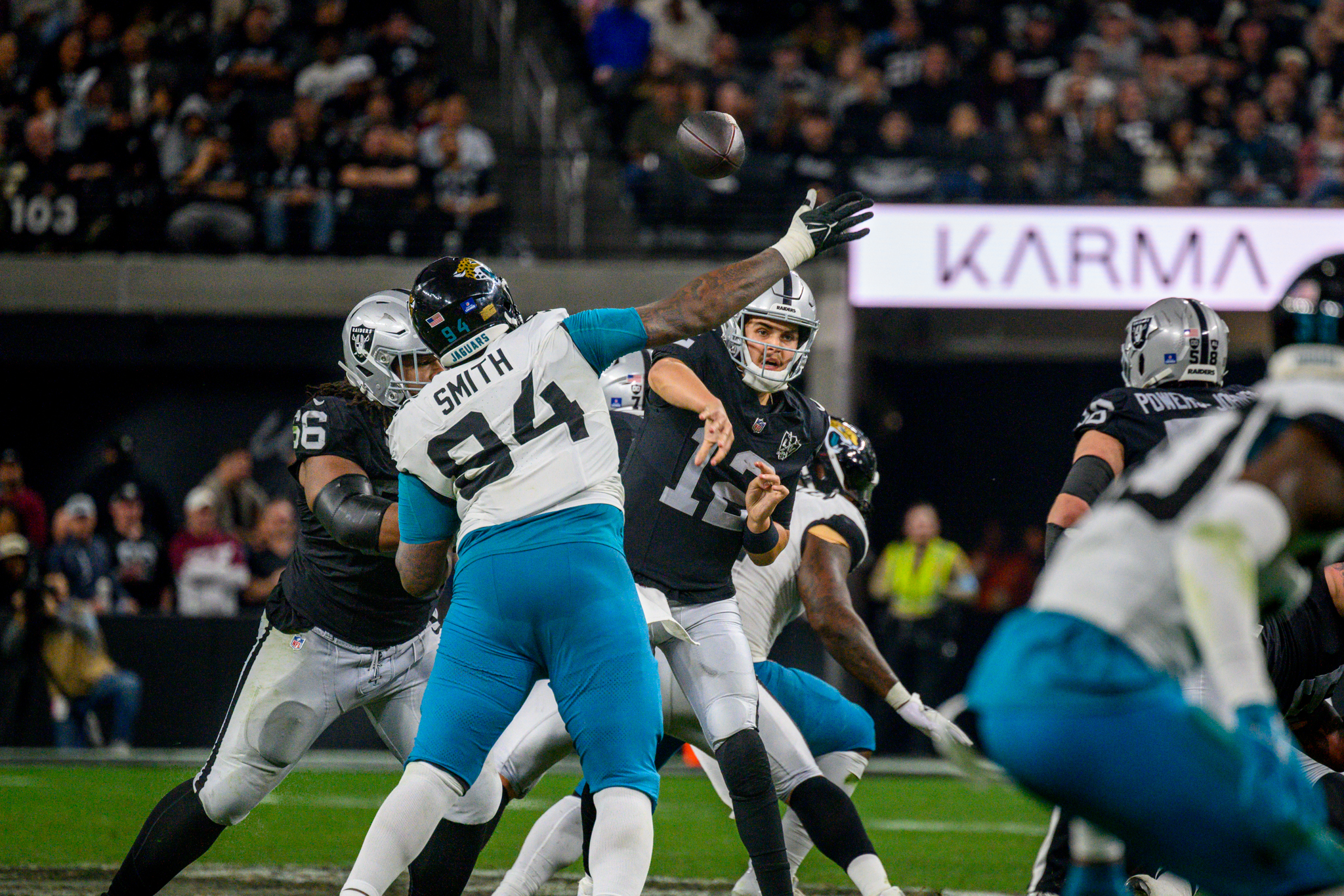 Amid the penalties and stalled drives was a gem of a play made by Raiders’ quarterback O’Connell. He escaped the clutches of a Jags defender and threw a pass while backpedaling to Ameer Abdullah on third down to keep the drive moving.