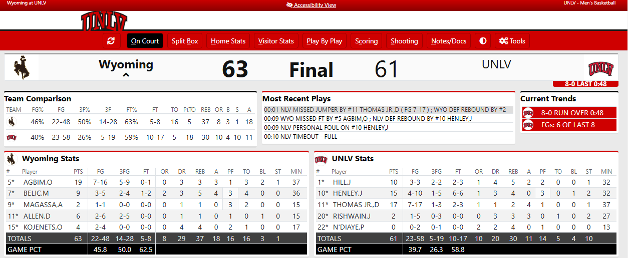It was Wyoming 49 and UNLV 43 with seven minutes to go after Bear Cherry scored a bucket.